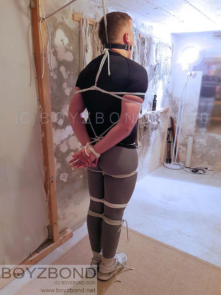 BoyzBond is strongly focussed on rope. The captives crotch-enhancing 'harness', the single rope tethering him to a ceiling hook plus the straps dangling on the wall indicate that beautification is not the sole objective here!