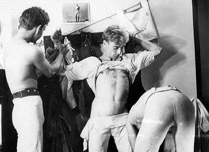The first thing you notice in this picture is Tom's amazing ass in the foreground and then Ned's equally well-upholstered crotch. They both seem engaged in a determined, truly manly struggle. The sexual chemistry that these two men and the photographer manage to create between them is still amazing 60 years on from the shoot. Percy, the immediate focus of their attentions fades away in comparison, pushed aside almost, even though he's just had his bell bottoms pulled down and bare ass exposed.